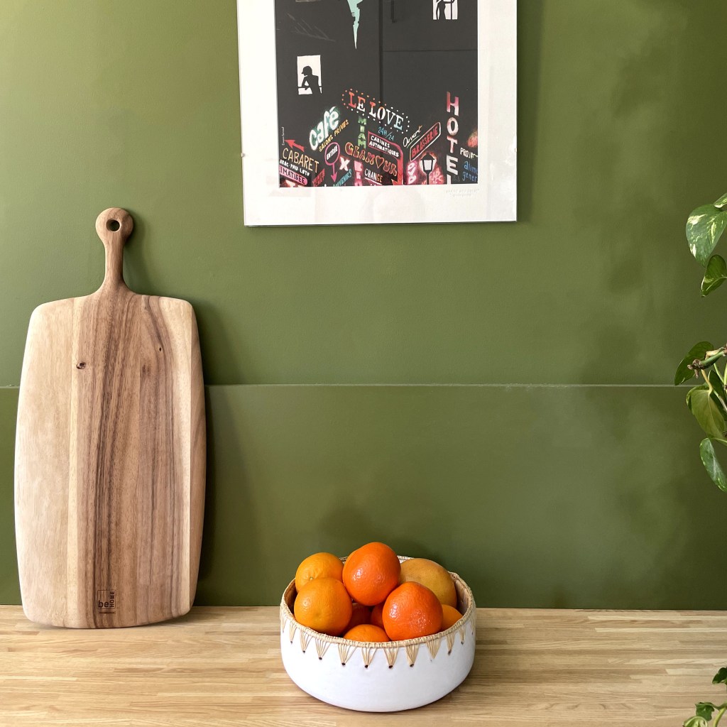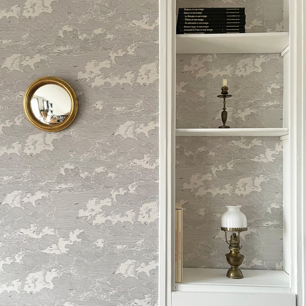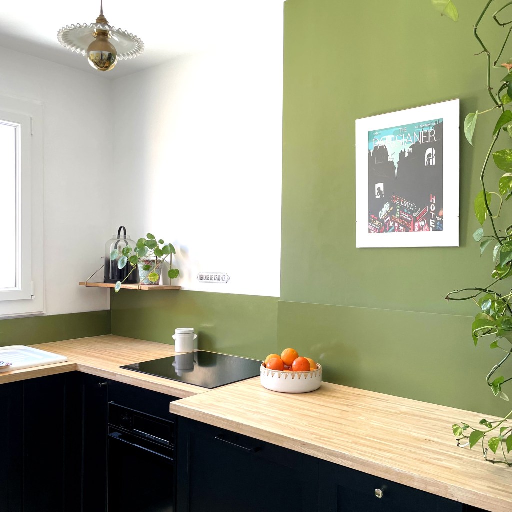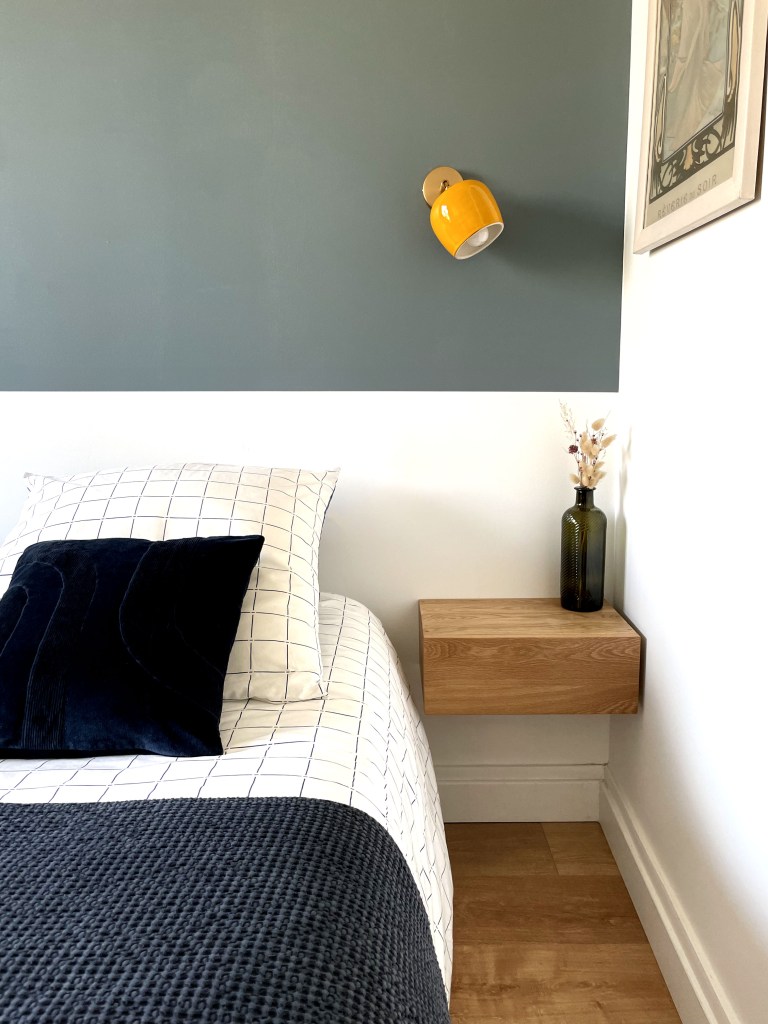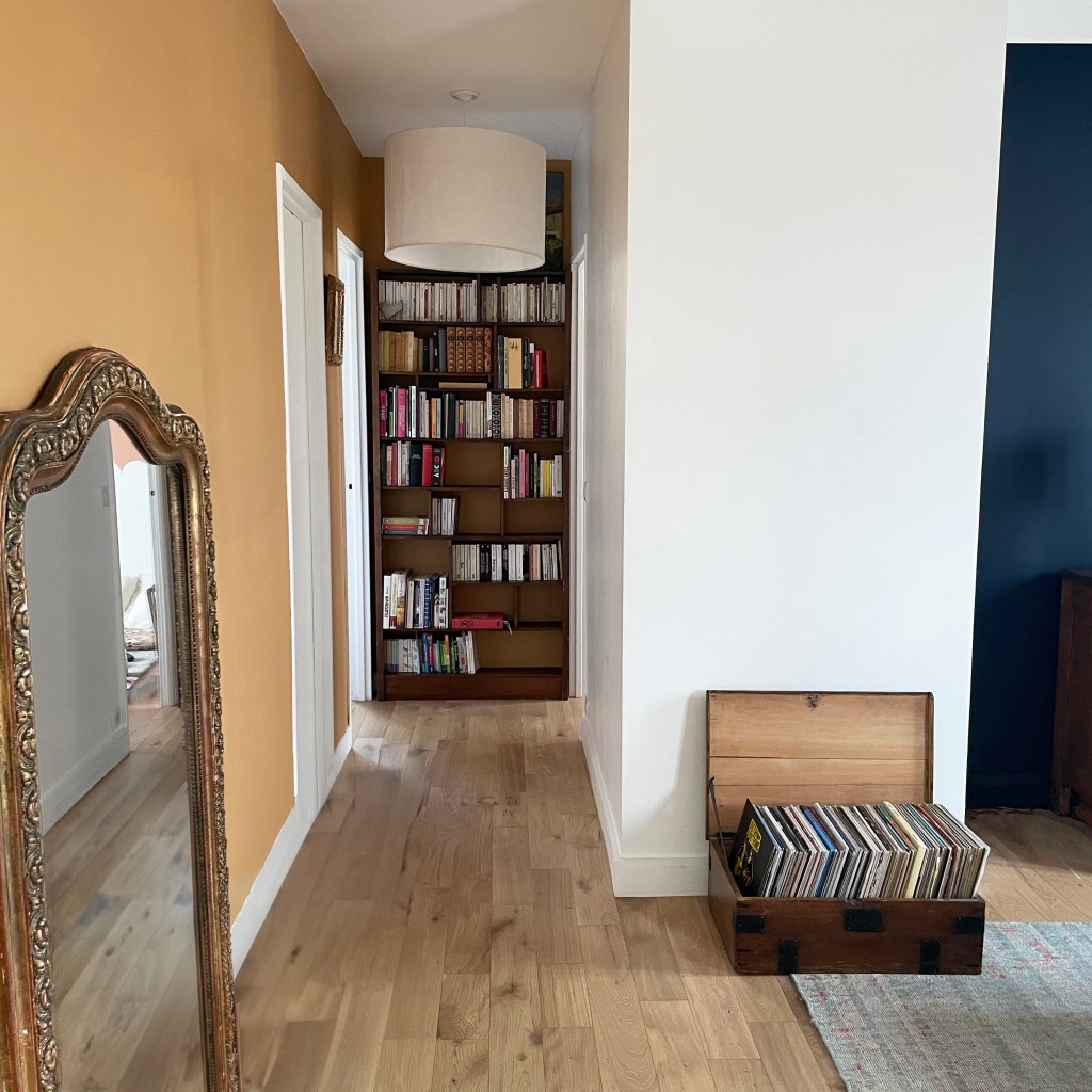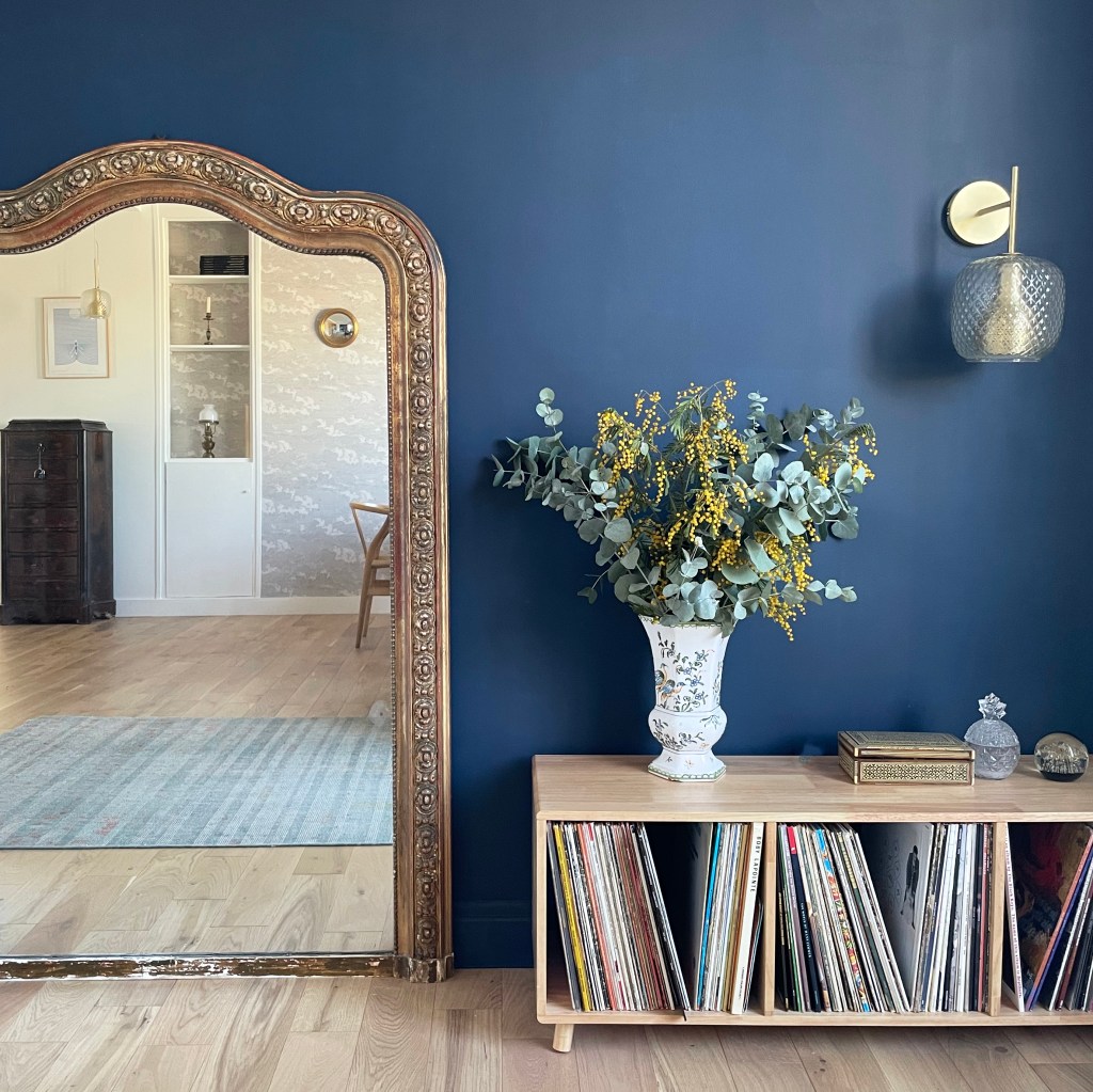 Dans cet appartement de 75 m², la couleur devient architecture. Les murs se parent de verts profonds et de bleus enveloppants, presque veloutés. Ils ne sont pas un décor, mais une présence. Ils structurent les volumes, dessinent les perspectives, accompagnent la lumière au fil de la journée. Le papier peint, aux motifs délicats et presque oniriques, introduit une vibration subtile. Il capte le regard sans l’imposer, crée des respirations dans les espaces de transition, et apporte une profondeur silencieuse. Face à ces aplats assumés, le mobilier ancien trouve une place naturelle. Un miroir doré aux lignes solaires, une lampe patinée, des pièces chargées d’histoire dialoguent avec la sobriété contemporaine. Un intérieur sensible, où la couleur révèle le caractère des lieux et où chaque pièce ancienne trouve un nouveau souffle.